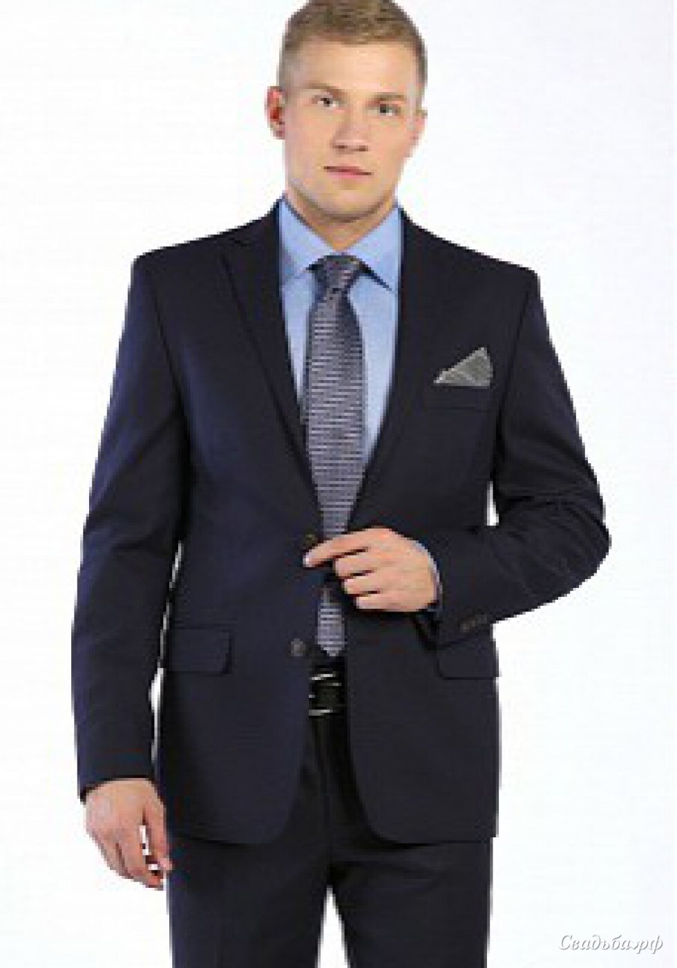 Классический мужской костюм полуприлегающего силуэта из костюмной ткани темно-синего цвета. Пиджак однобортный с одной шлицей и узким лацканом, тремя внутренними карманами. Контрастная дышащая подкладочная ткань.
