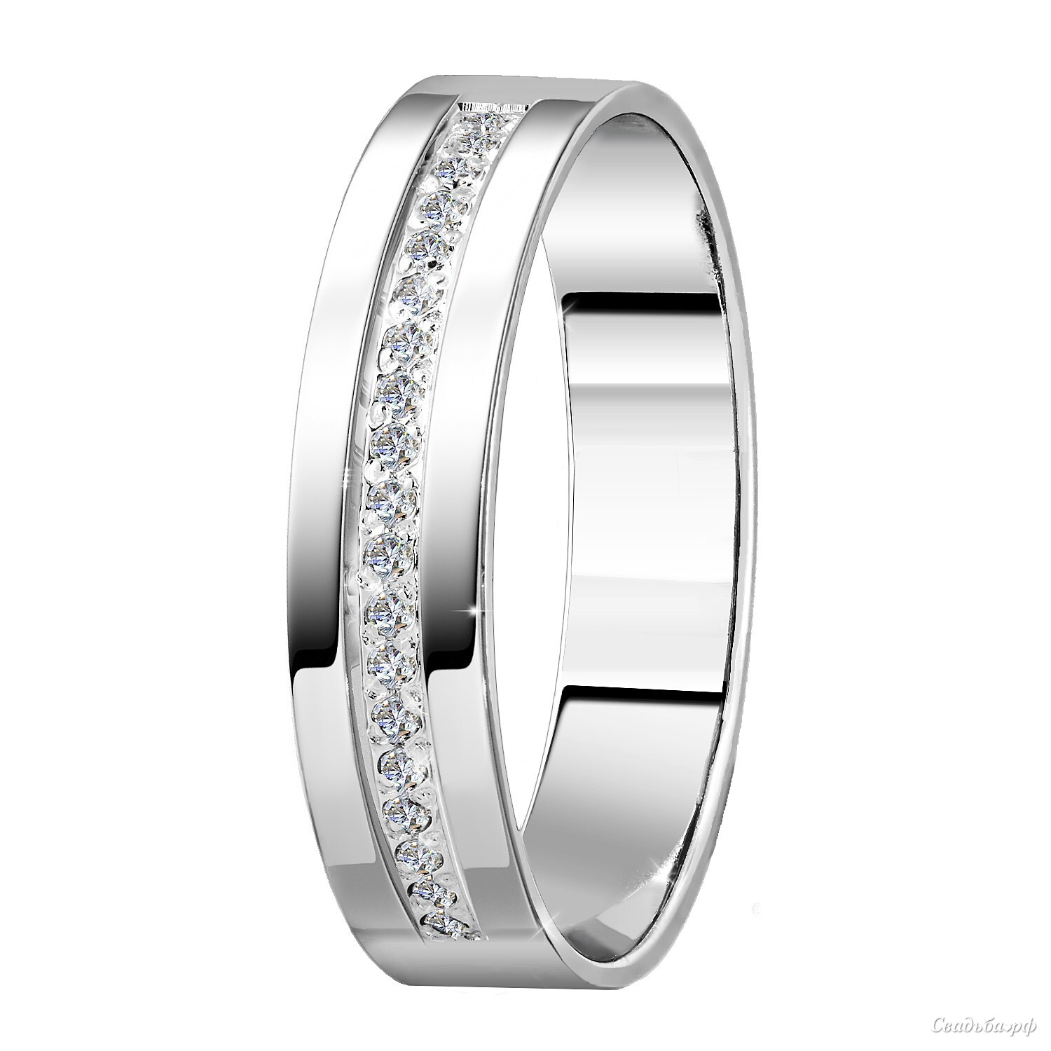Обручальное кольцо из белого золота 585 проба. По середине кольца, проходит дорожка из 19 бриллиантов. Ширина шинки составляет 4 мм. Эта модель невероятно нежно и стильно смотрится на руке.