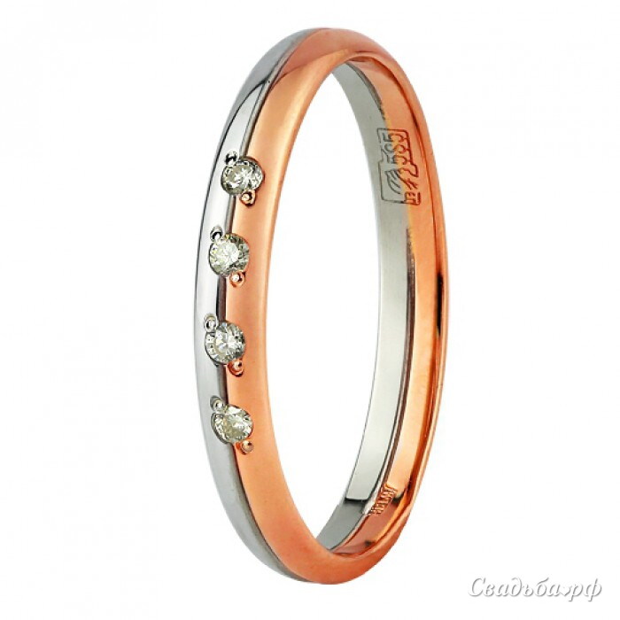 Комбинированное обручальное колечко отечественного производства отличается продуманным до мелочей дизайном и безупречными формами. Изящный ободок состоит из серебристой и золотистой частей, разделённых между собой продольным желобком. Модель декорирована четырьмя ослепительными бриллиантами безупречной огранки.