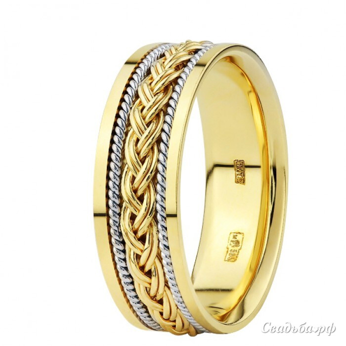 Массивное обручальное колечко от лучших отечественных ювелиров станет Вашей гордостью и настоящей семейной реликвией. Эта стильная модель выполнена из жёлтого золота. Широкий ободок украшен золотистой косой и двумя перекрученными нитями из серебристого драгоценного металла. С таким роскошным кольцом Вы всегда будете в центре внимания.