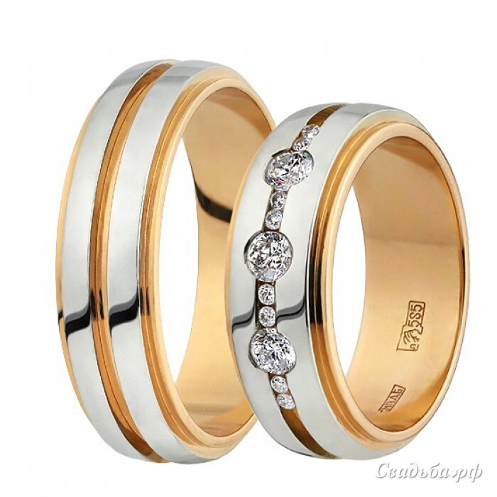 Роскошные парные обручальные кольца из желтого и белого золота 585 пробы, вариант для нее декорирован бриллиантами. Дизайн украшений подчеркивает индивидуальность будущих жениха и невесты, однако при этом кольца выдержаны в одинаковом стиле: сочетание разных оттенков металла и бриллианты в женской позиции создают праздничное настроение. Выпуклая поверхность украшения создана по технологии comfort fit, что делает носку особенно приятной.