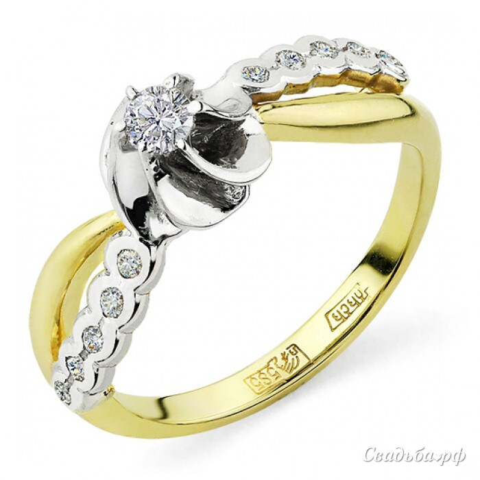 Оригинальное помолвочное кольцо создано отечественными ювелирами для самых стильных натур. Ободок необычной формы выполнен из жёлтого золота и дополнен вставками из белого драгоценного металла. В искусной оправе расположился сверкающий бриллиант. По обе стороны от главного камня рассредоточились бриллианты меньшего размера.